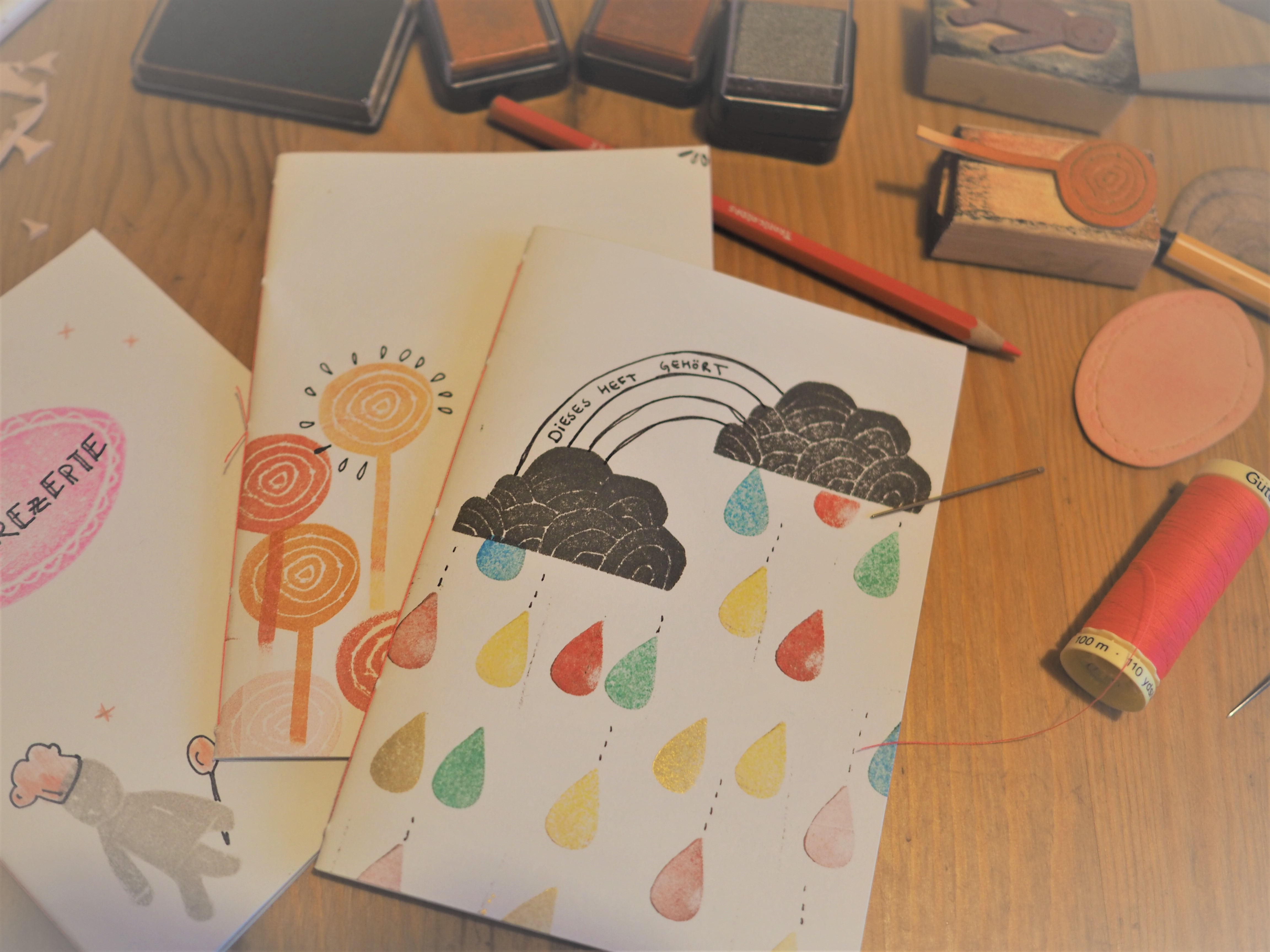 Schulheftung klingt erstmal nach Schule und Arbeit. Macht aber einfach nur Spaß. In diesem Online-Workshop lernen wir zwei Varianten einer einfachen Heft-Methode kennen. Die beiden kleinen Hefte, die dabei entstehen, kannst du ganz vielfältig einsetzen: Als Rezepteheft, für Notizen oder kleine Gedichte, zum Malen oder für Fotos. Für deine individuelle Idee stellen wir ebenso individuelle Stempel her, mit denen wir die Heftumschläge kreativ gestalten.